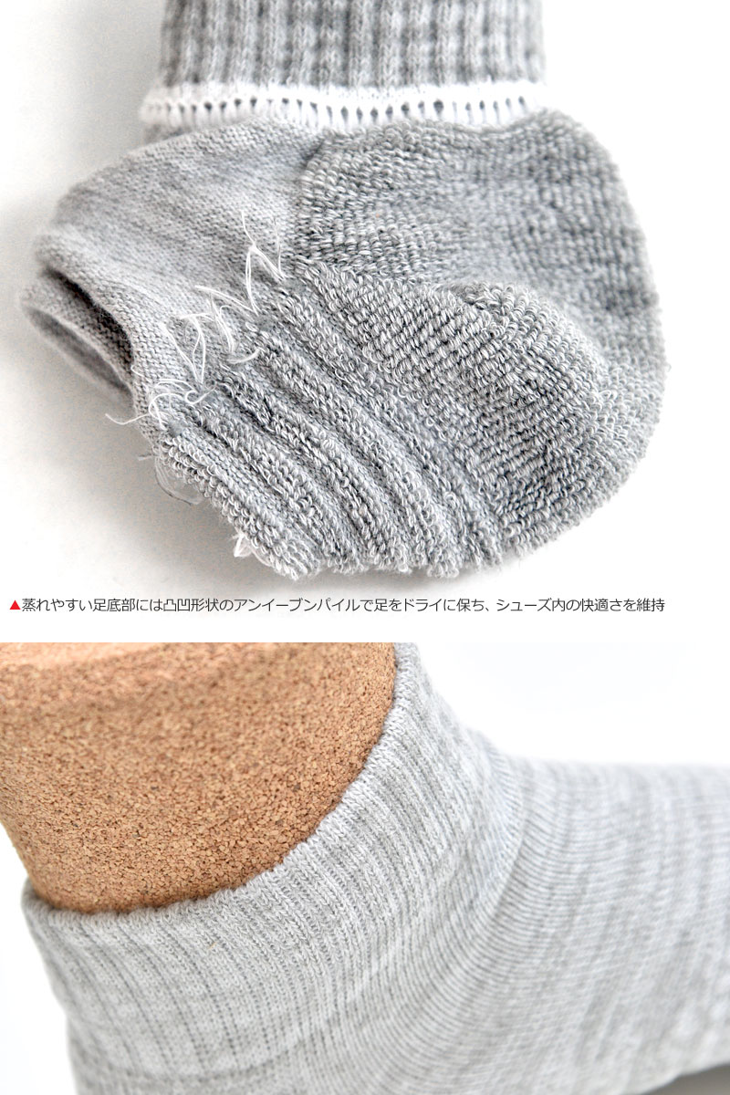 臭いの発生を抑える抗菌防臭機能と吸汗速乾機能を備え、蒸れやすい足底部には凸凹形状のアンイーブンパイルを入れることで足をドライに保ち、シューズ内の快適さを維持します 素材コットン/ポリエステル/ポリウレタン 生産国ベトナム製 主な仕様・アンイーブンパイル ・抗菌防臭加工 ・吸汗速乾性 ・アーチサポート ・くるぶし上丈 ・3足パック サイズXS:21-23cm S:23-25cm M:25-27cm L:27-29cm [N]ネイビー [GM]グレーモク [W]ホワイト [K]ブラック [B]ブルー 注意事項 ※商品・商品画像についての注意事項はこちらもご確認ください 関連キーワード 靴下 ソックス スニーカーソックス アンクルソックス くるぶし丈 アウトドア トレッキング ハイキング キャンプ 山登り トレイル ランニング スポーツ トレーニング フィットネス トラベル 旅行 通勤 通学 部活 サイクリング 自転車 男女兼用 ユニセックス ■ショート丈もあります