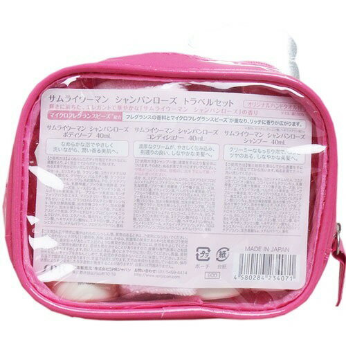 お店TOP>化粧品・コスメ・ビューティー>シャンプー>トラベルセット>サムライウーマン シャンパンローズ トラベルセット (1セット)商品区分:化粧品【サムライウーマン シャンパンローズ トラベルセットの商品詳細】●マイクロフレグランスビーズ配合●シャンプー、コンディショナー、ボディソープ、タオルがポーチに入った旅行用セットです。