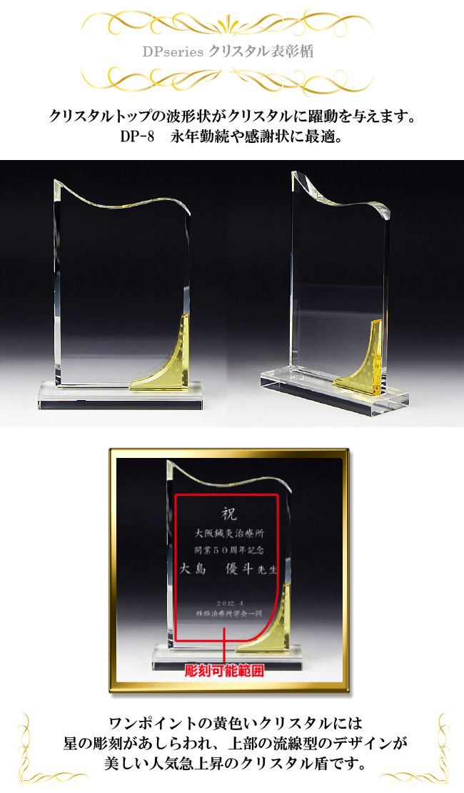 美しく名入れ彫刻されたクリスタル盾は受け取られた方の感動が違います!高級感のある化粧箱入りで、熨斗・ギフト包装・贈答に最適な手提げ紙袋を無料でお付けします! 材 質エコロジークリスタルガラス サイズ 【大A】幅18cm×高24.5cm×奥6cm 【中B】幅16cm×高22cm×奥6cm 【小C】幅14.5cm×高20cm×奥6cm 包装化粧箱入り 用 途退職記念、定年退職、卒業記念、入学記念、周年記念、社内表彰、永年勤続表彰、優秀賞、ゴルフコンペ、ギフト 備考オリジナル彫刻で世界でひとつだけのオリジナルトロフィーや盾が製作できます! ※価格に含まれるもの (商品代金・校正代金・彫刻代金) (ロゴマークなどデーターを作成する必要がある場合には 別途費用がかかる場合がございます。